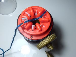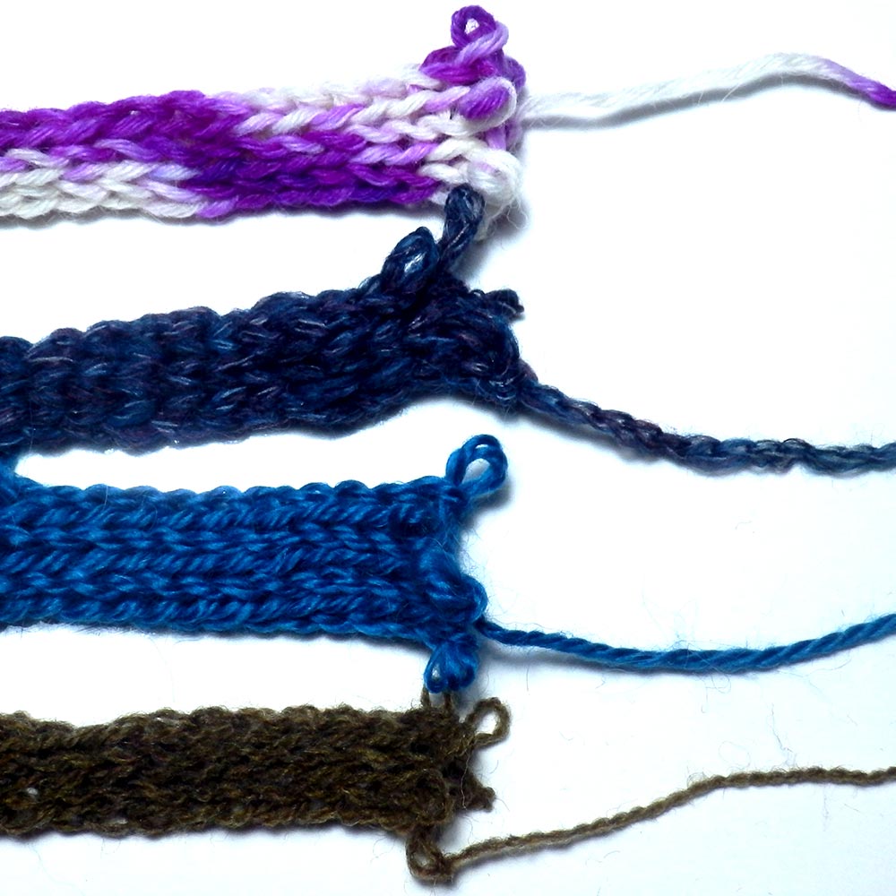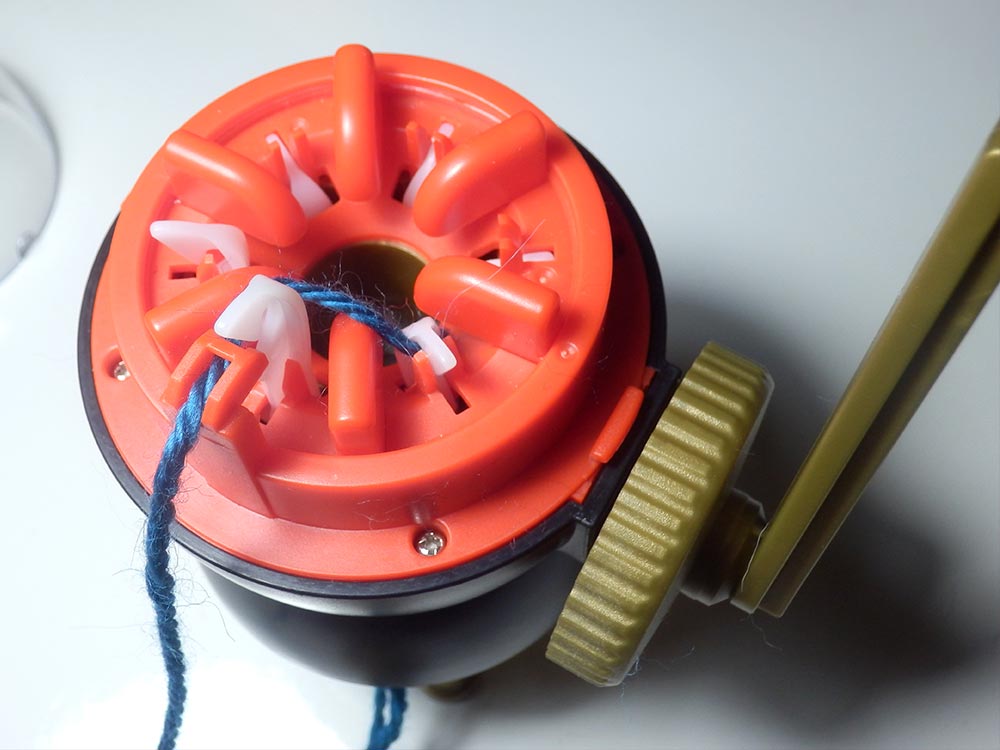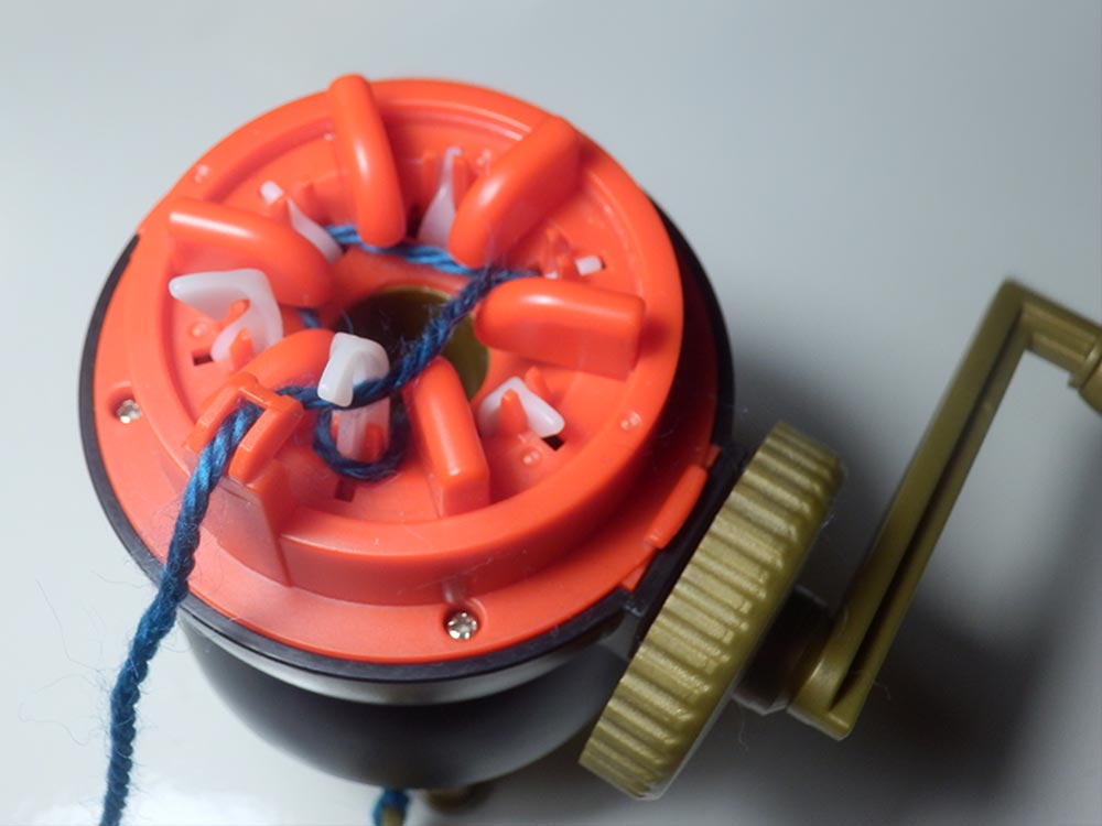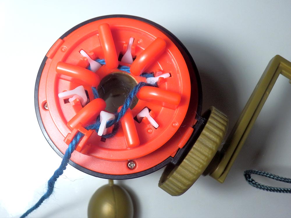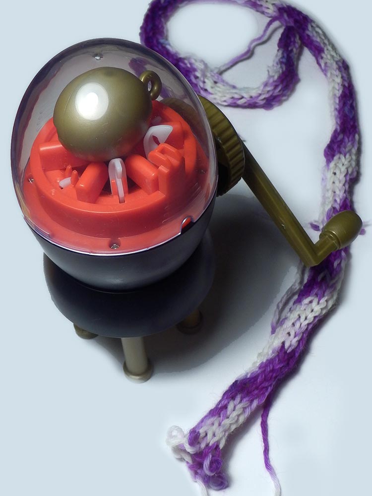 Nun könnten wir den Deckel nach der Anleitung drauf stecken und kurbeln, doch dieses empfehle ich erst einmal nicht. Gerade zu Anfang macht es Sinn, den Faden zu beobachten und das geht besser ohne Haube. Ich brauchte einige Anläufe, um die richtige Fadenspannung heraus zu finden. Auf dem nächsten Bild sieht man im Hintergrund etwas geknubbel, doch es ging immer besser und ich gebe nicht auf. Am besten gefiel mir das Ergebnis mit der 8 fädigen Sockenwolle, das ist die Bunte ganz oben im Bild.