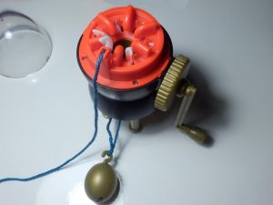 Danach einfach mitten durch und unten das Ei-Gewicht in eine Schlaufe einhängen. (süß das dieses auch eine Eiform hat, ich liebe solche Details) (Bild 2)