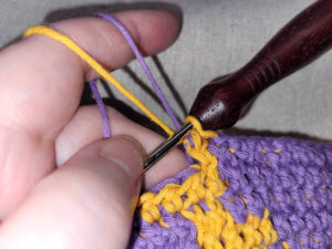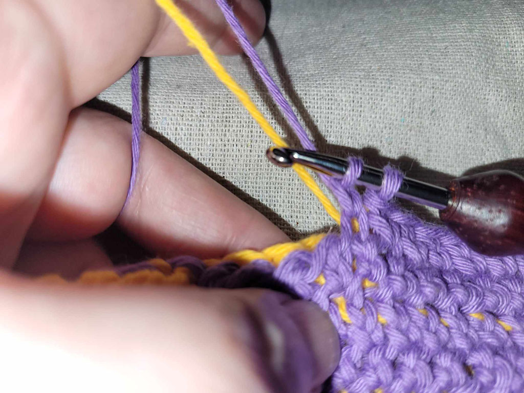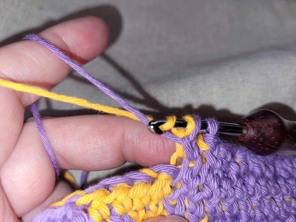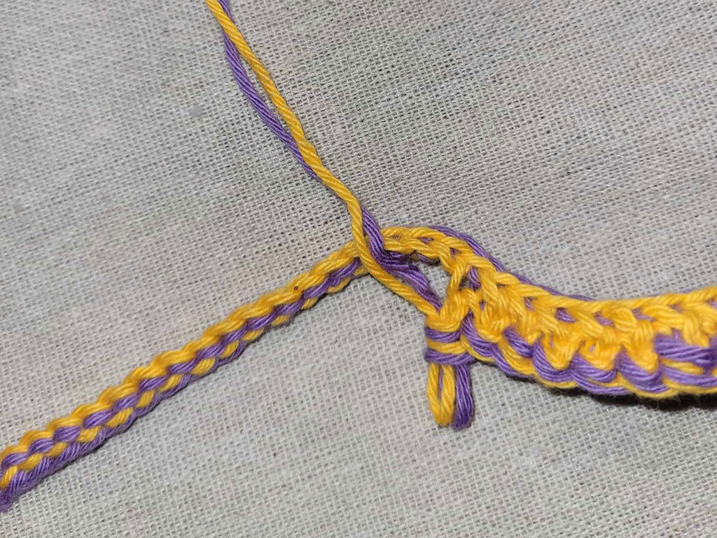 Eine Masche vor einem Farbwechsel die Masche mit der hinteren Farbe beenden.