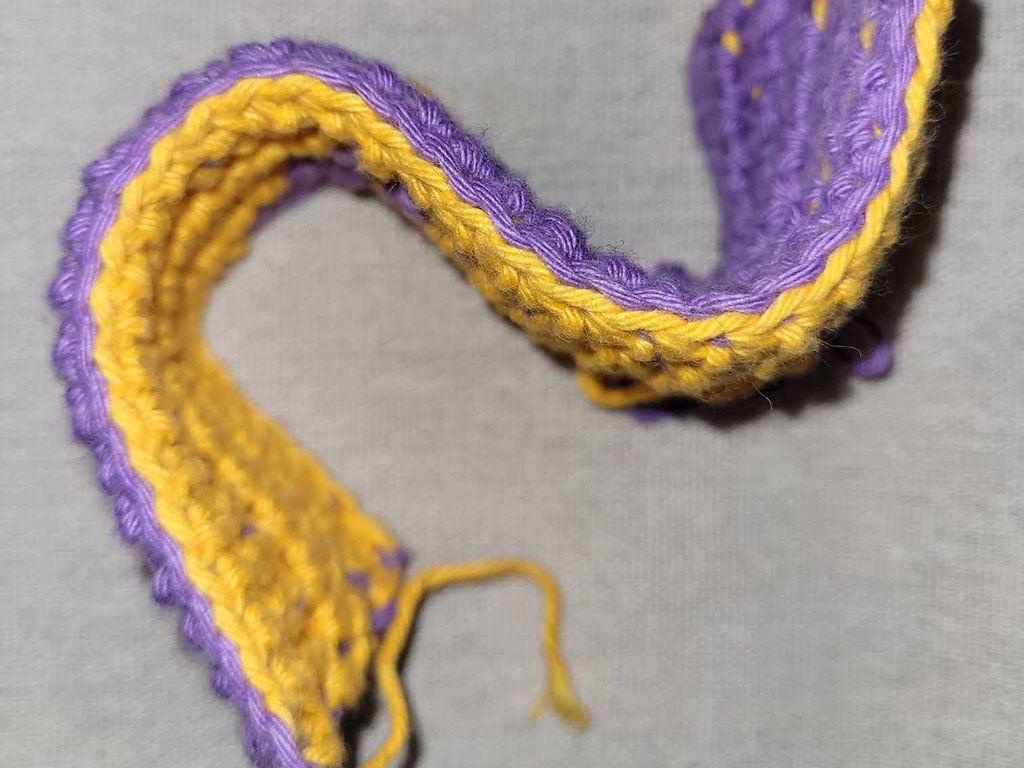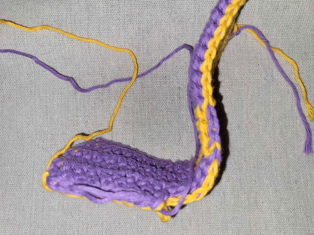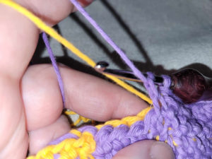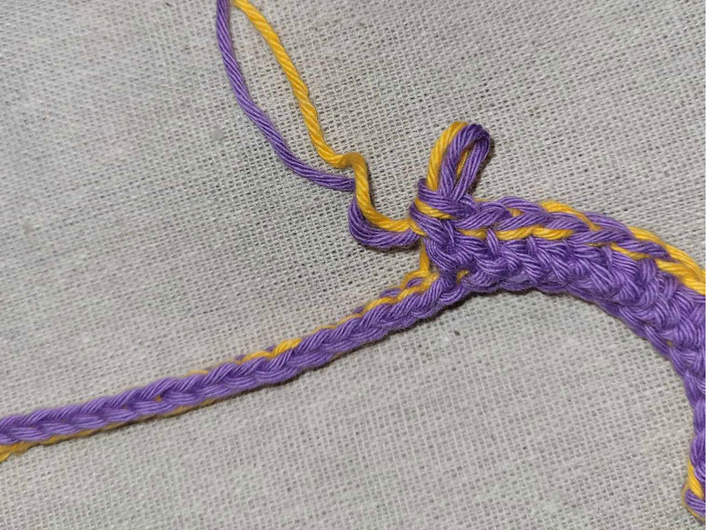 Farbe 2: Neue Reihe am Anfang beginnen. Eine Reihe Kettmaschen in die Unterseite einstechen. Ist nervig, aber lohnt sich! Beide Schlaufen sollen an der gleichen Seite enden.