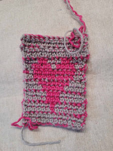 Fazit: sehr gewöhnungsbedürftig, aber das ist das Doubleface stricken ja auch. Jetzt habe ich die Hälfte von meinem Versuchstopflappen geschafft und es geht recht flüssig. Würde ich damit einen ganzen Schal häkeln? Kann man mit sehr dünnem Garn machen und es sind auch viele Muster möglich. Aber man muss immer gucken wo man genau einsticht, Fernsehtauglich ist es nicht. Für einen Topflappen aber eine tolle Möglichkeit! Es fühlt sich gut an, ist nicht steif, aber dick.