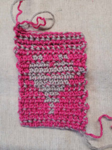 Jetzt geht es nur um das Einstechen. Hier ist noch ein altes Foto wo ich die Maschen zusammen abgekettet hatte. Das machen wir nun anders! Eingestochen hatte ich die entsprechenden Farbe immer nur in eine Schlaufe bzw. Steg.