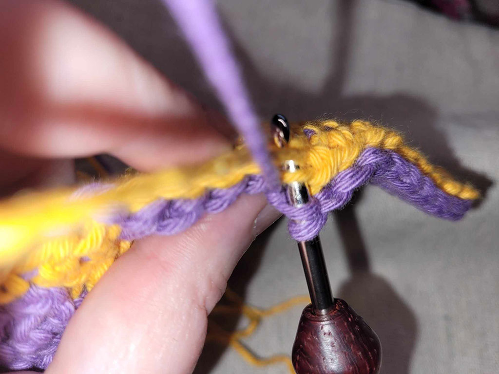 Der letzte Schritt, alle 3 Schlaufen mit der vorderen Farbe auf einmal abhäkeln.