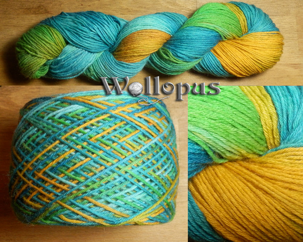 Bei dem letzten Strang habe ich etwas experimentiert. Zuerst den Stang in einer helleren Grundfarbe färben und direkt aus der Tube Lebensmittelfarbe drauf tupfen. Vom Prinzip her gefällt mir das ganz gut, doch beim nächsten Mal werde ich in einer Farbgruppe bleiben.