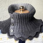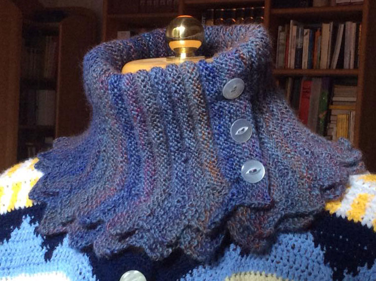 Bein einigen strickte sie noch eine Knopfleiste an. Einfach ein bisschen mehr als die Hälfte abketten, aus den verbleibenden Maschen die Blende in Kraus rechts Stricken und die Knöpfe drauf nähen. An der Unterkante mit ein paar Stichen befestigen.