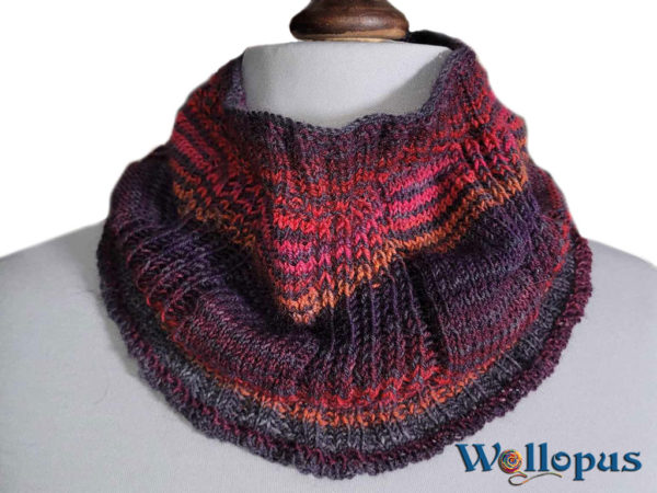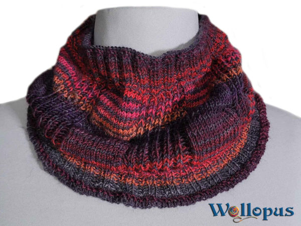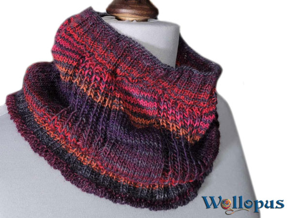 Das Muster soll das schöne Garn mit dem interessanten Farbverlauf nicht stören, aber trotzdem etwas besonderes sein. Das erreichen wir mit den breiten verschieden gestrickten Streifen die eine glatte und eine etwas lockere Struktur haben. Zusätzlich wirkt der glatte Teil zu groß was schön plustig wirkt.