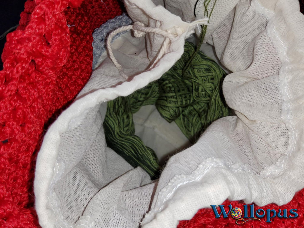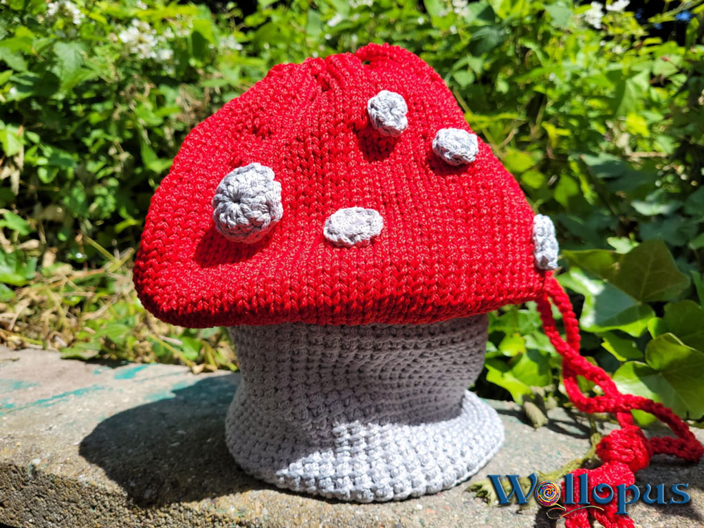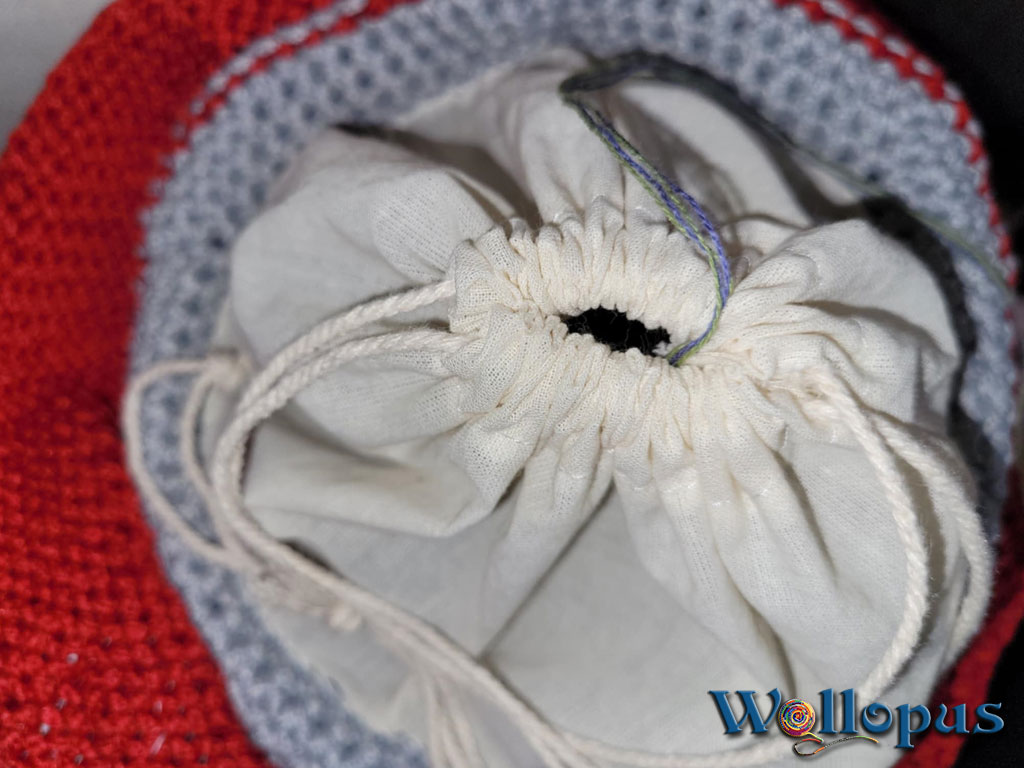 Ein toller Beutel oder Tasche oder UFO-Versteck. Dieser Pilz sieht gut aus, ist aber auch super praktisch. Unten passt genau ein Bobbel mit 200g (800m) hinein. Da kann er auch bleiben, der er wird nicht zusammen fallen. Oben und unten schützen ihn 2 Metallringe gegen quetschen. Innen ist ein Beutel eingenäht, der wird zugezogen und den Faden in der Mitte durch das Loch geführt. Oben drauf kann man das Gestickte oder Gehäkelte deponieren und nichts kommt durcheinander.