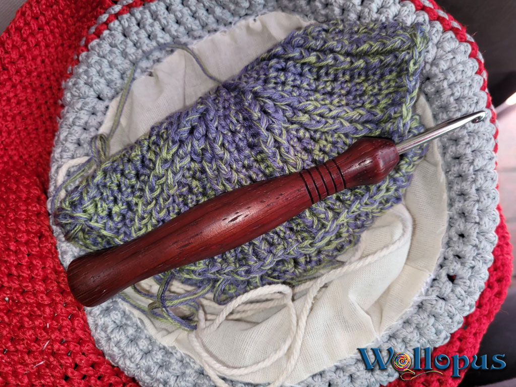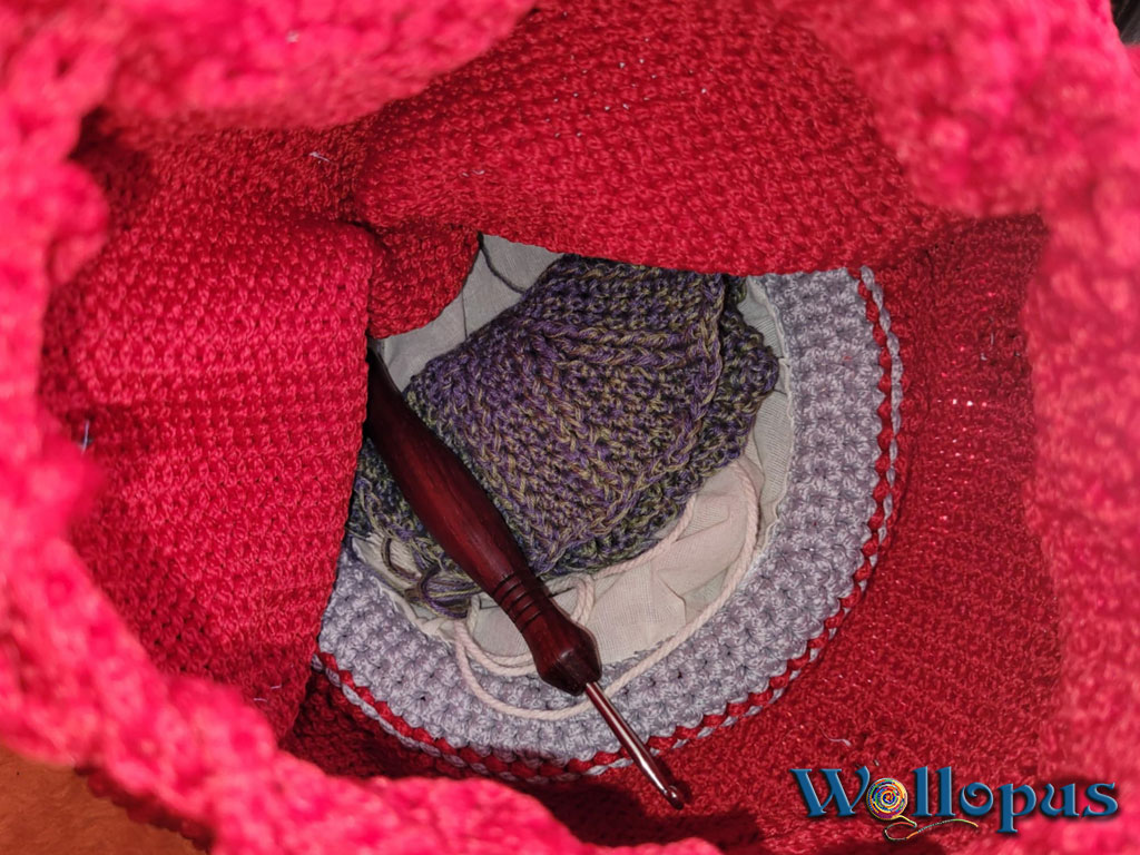 Mit dem Prototypen bin ich schon verreist, einschließlich Bobbel drin (siehe Tuch Ingvild). Das hat so fantastisch geklappt, das ich so einen Beutel noch einmal in schön machen wollte. Einschließlich einigen Verbesserungen. Mir war der obere Teil zu klein und zu löchrig. Bilder und wie der Prototyp (das Braune) gemacht wurde, ist ebenfalls in der Anleitung grob beschrieben.