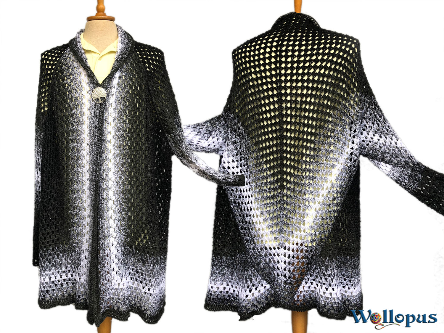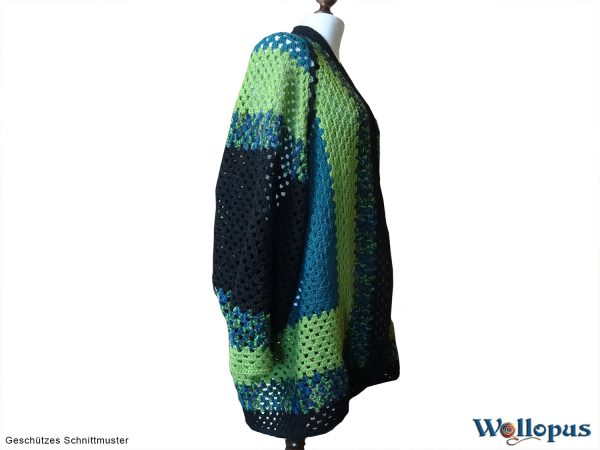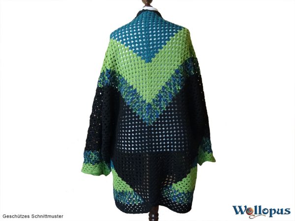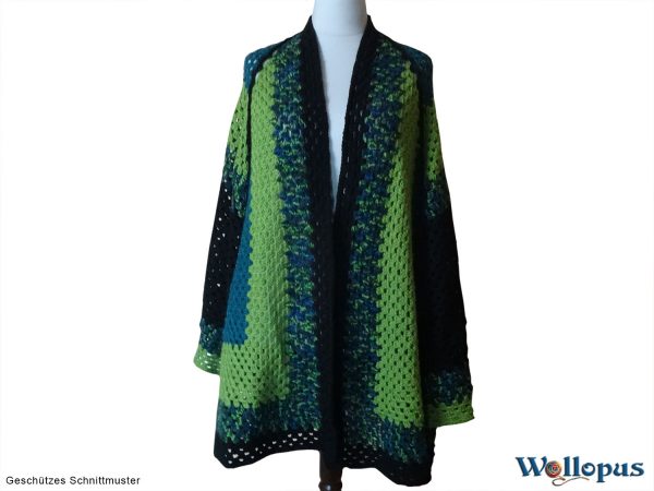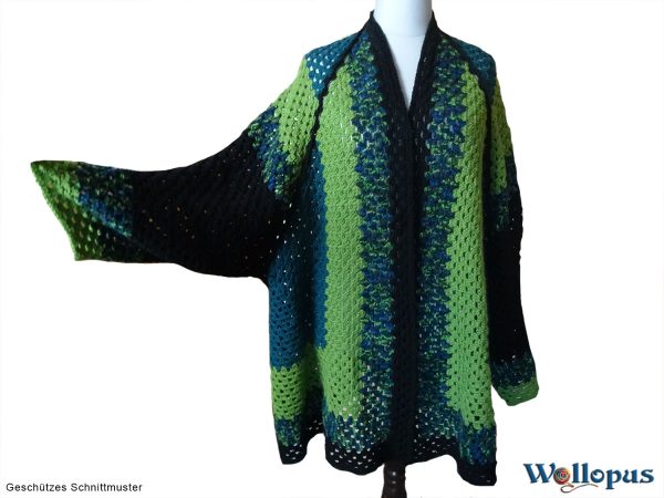 Die grün-schwarze Jacke ist aus einem Polyacrylgarn gehäkelt mit Ns. 5 und meine Beispielbeschreibung.