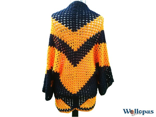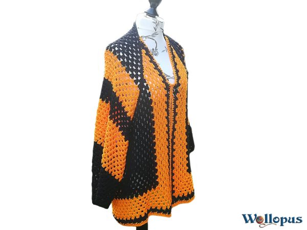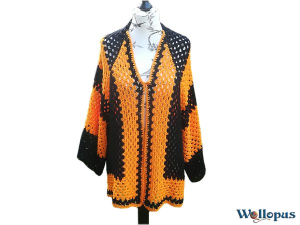 Die apriot-schwarze Jacke ist aus Myboshi Garn No2. 11 Knäule schwarz und 10 Aprikose No 2 bräuchtet ihr für Größe 42/44