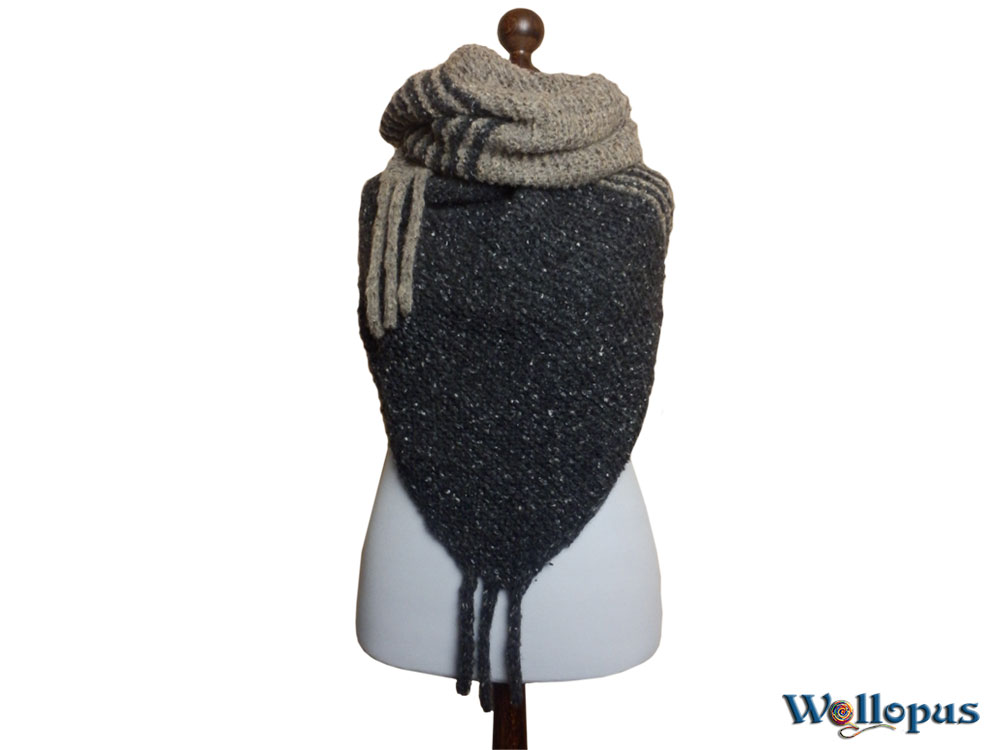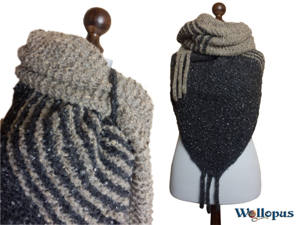 Das Tuch ist kraus rechts gestrickt und hat rundherum einen i-cord Rand für einen sauberen eleganten Abschluss der in den Zipfeln endet.