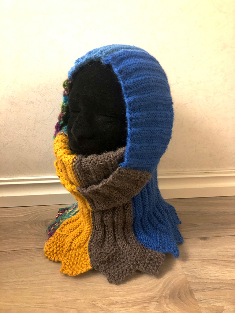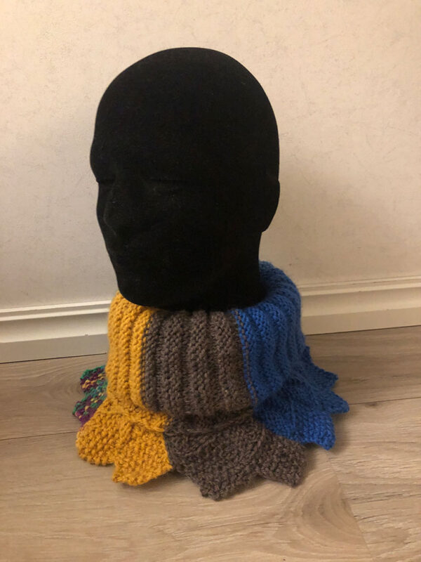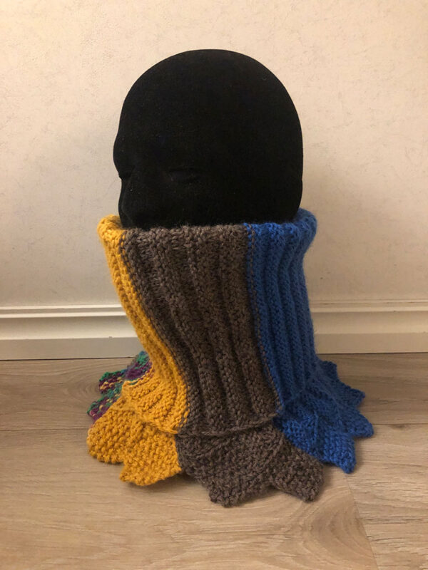 Anstatt einfach kraus zu stricken haben wir hier in den Ecken ein Perlmuster und im Mittelteil entstehen Rippen. Durch diese Rippen zieht sich der Nook in der Mitte zusammen, so das er ausgezeichnet am Hals anliegt und so kuschelig warm hält.