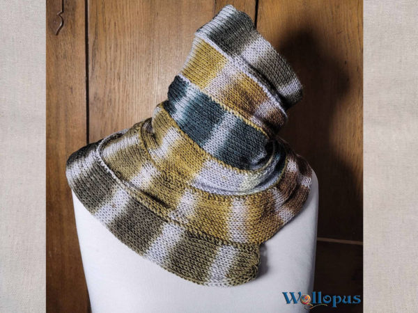 Der hellblaue große Loop ist aus der Woolly Hugs LACE und wird mit der addi Express Kingsize (46 Nadeln) und der kleinere ist aus der Woolly Hugs Paint Socks und der kleinen addi Express (22 Nadeln) gekurbelt.