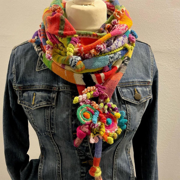 Wer immer noch nicht genug an Ideen hat, der kann sich zusätzlich noch beim Häkeln austoben! Als dieser KAL (englisch: Knit a long – gemeinsam stricken) begann die Ausstellung über das gehäkelte Korallenriff in Baden Baden. Und was passiert? Eine neue Idee: eine oder mehrere Korallen auf diesem Loop müssten doch fantastisch aussehen!