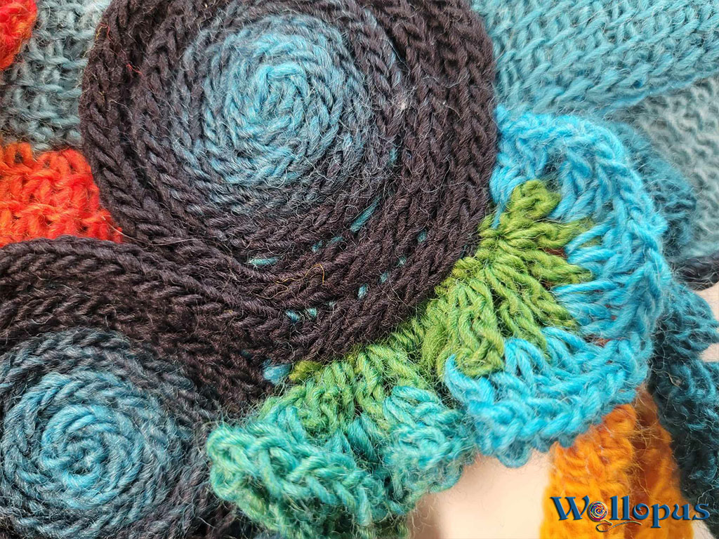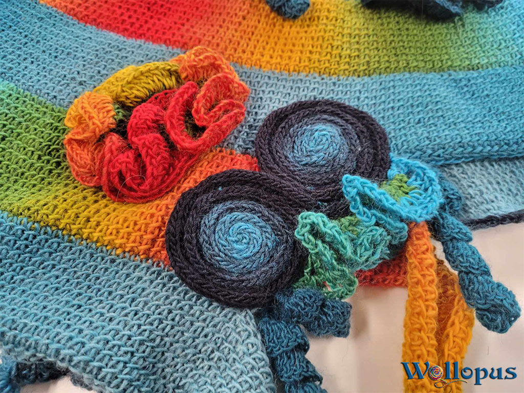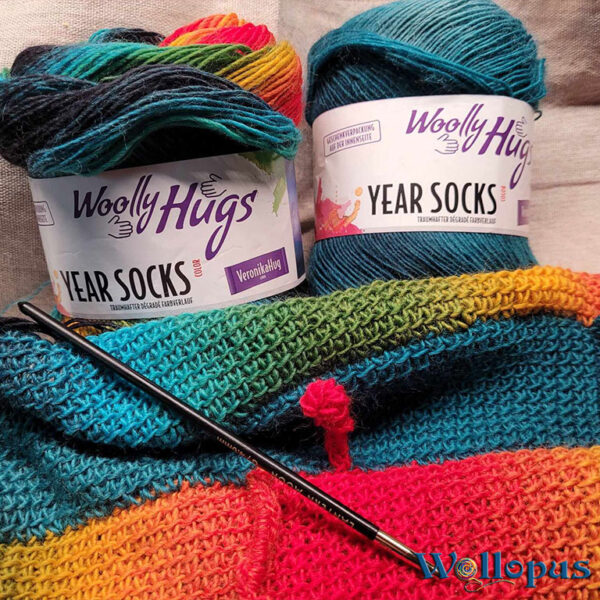 Dieser Noose-Loop ist ein wahres Farbenfeuerwerk! In fröhlichem tunesischem Häkelmuster, gefertigt aus den beliebten „Woolly Hugs Year Socks“ in Regenbogenfarben und Petrol, präsentiert er sich als einzigartiges Accessoire. Die besondere Optik entsteht durch die zweifarbige Verarbeitung, die einen faszinierenden Doppelhelix-Effekt erzeugt.