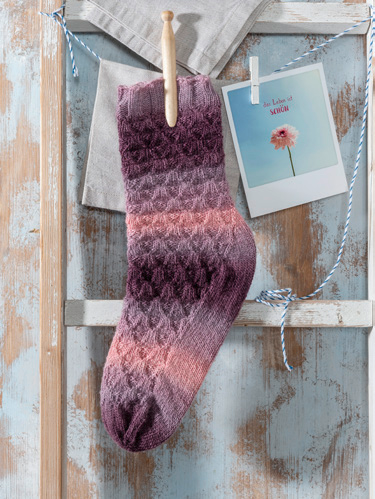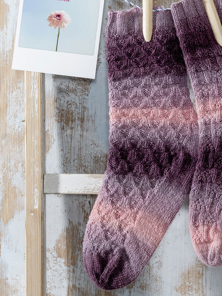 Die Modelle haben sehr effektvolle und dennoch meist einfache Muster, die durch die wunderschönen Farbverläufe der Woolly Hugs YEAR SOCKS Garne besonders schön zur Geltung kommen. Überwiegend gibt es rechts/ links Muster, jedoch sind auch einige dabei, die etwas herausfordernder sind.