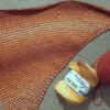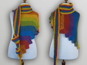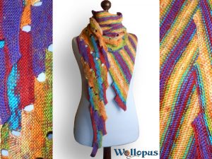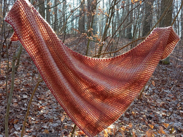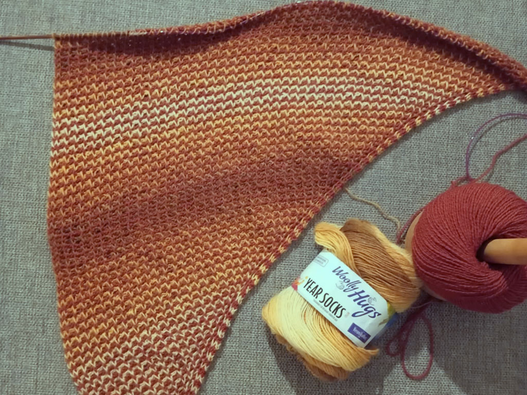 Das rötliche Tuch mit dem interessanten gelben Streifen ist von Sascha und aus einem anderen Garn. Danke dir fürs Foto 🙂