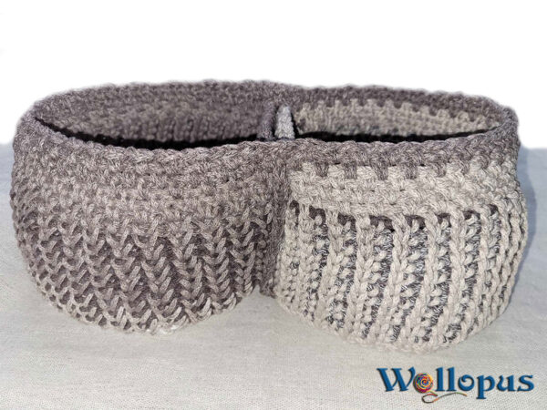 Hier seht ihr nun 2 Körbchen mit meinem tunesischen Lieblingsmuster. Die Körbchen habe ich einzeln gehäkelt und zum Schluß aneinander genäht. So habe ich das WAS ich wollte, aber nicht WIE ich es wollte.