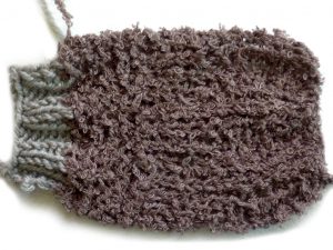 Auf dem Bild seht Ihr eine Probe. Ich habe rechts mit Frottee und *2 re, 2 li* angefangen. Danach ein Stückchen glatt rechts und die letzten Reihen kraus rechts.