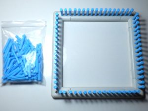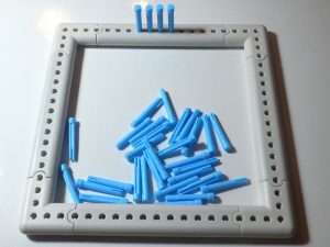 Ungeduldig wie ich bin, baue ich als erstes den kleinen eckigen Rahmen und stecke die Pinnchen hinein. Es ist etwas stramm, aber das muß so sein, sie sollen ja halten. Gezählt habe ich nicht, doch es scheinen genug da zu sein.