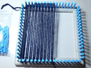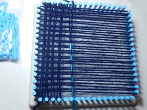 Nun gehts los, die Wolle mit einer Schlaufe antüddeln und um die Pinnchen wickeln. Auf dem 2. Bild seht ihr den Richtungswechsel.