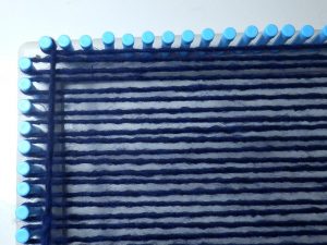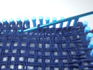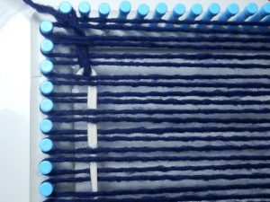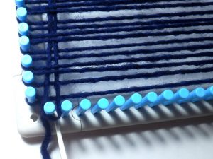 Ab hier wird gewebt. Jetzt kommt diese lange Häkelnadel zum Einsatz. Immer rauf und runter und den Faden einhängen und durchziehen. Unten um das Pinnchen hängen.